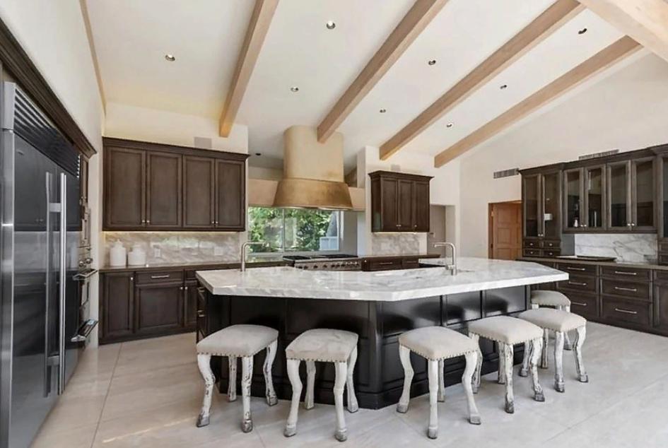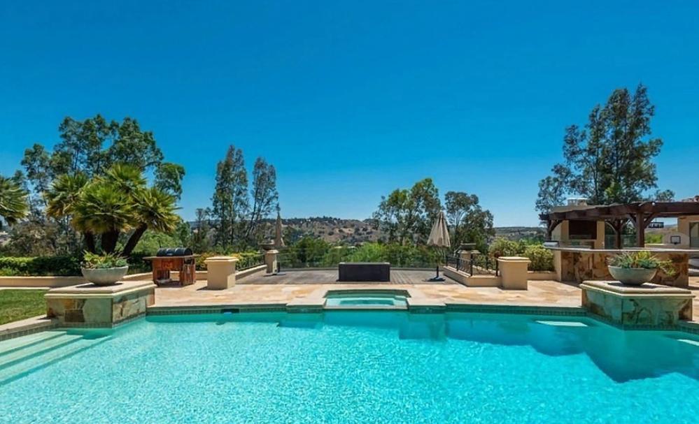 На заднем дворе в курортном стиле вы можете увидеть шикарный глубокий бассейн с лазурной водой, баскетбольную площадку, встроенное барбекю, патио с камином и музыкальный телецентр. В этом особняке есть все для шикарного отдыха и времяпрепровождения после тяжелого рабочего дня.