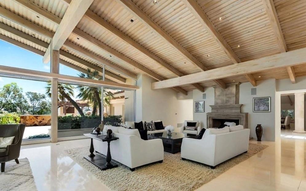 В комнате обустроены световые люки и стеклянные стены, а деревянный потолок, большой камин и пальмы за окном добавляют незаменимый уют.