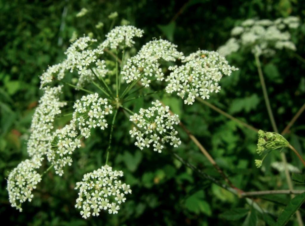Соцветия цикуты своими маленькими белыми цветочками очень напоминают дикую морковь. Чтобы не ошибиться, нужно помнить, что у дикой моркови есть крошечный красноватый цветок в самом центре кисти.