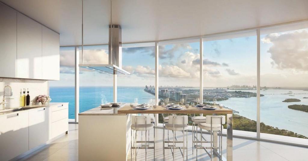 Апартаменты также располагают почти 3 000 кв. м открытых террас с летней кухней, частным бассейном и садом. С пентхауса открывается замечательный вид на 360 градусов всего побережья и центра Майами.